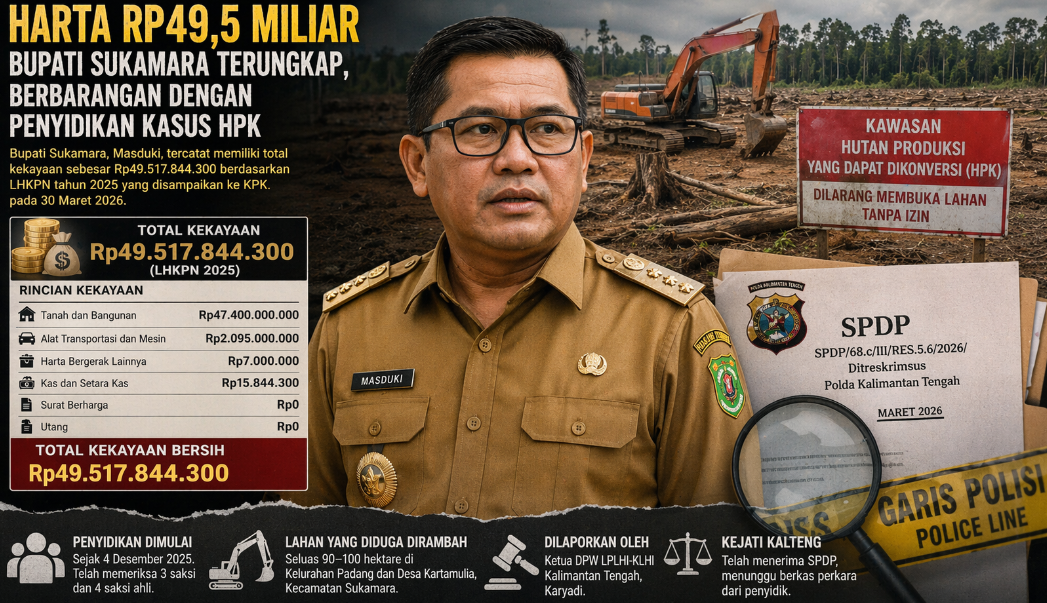 PALANGKA RAYAFolitimes.id-Laporan harta kekayaan Bupati Sukamara, Masduki, menjadi sorotan publik di tengah proses penyidikan dugaan perambahan kawasan Hutan Produksi yang dapat Dikonversi (HPK) oleh Polda Kalimantan Tengah.